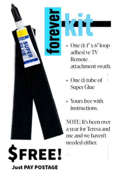 P.P.S. -- We've got your six (6) with "Forever Kit" -- In a few years you can repair any loose ends with a 6"x1" black loop adhesive strip to re-attach the TV Remote plus a tube of super glue to "touch up" the 2nd magnet attachment to your current Fidget-of-Choice. Free forever. Just pay shipping!